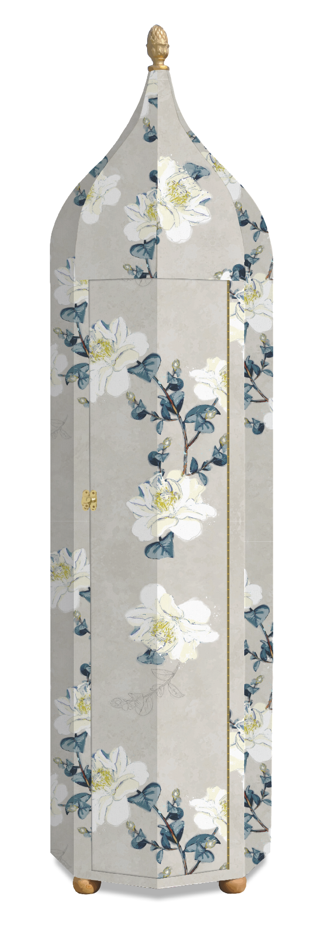 A classic campaign style cabinet covered in a 100% cotton floral fabric.  Fully lined.  Solid brass piano hinge with solid brass simple latch gate closure.   Single door for access to interior.  Semi sealed ceiling, to allow access to dome void.